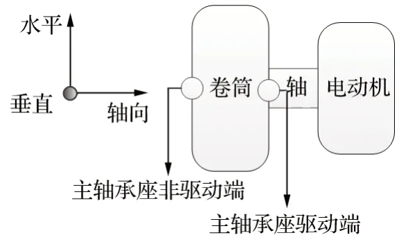 2.3 主軸承振動測試方案 在提升機正常運行下,利用測振儀器對電動機和滾筒的連接主軸承進行振動檢測,經過儀器自帶的軟件進行頻譜分析后得到振動頻譜圖,再與軸承的故障頻率進行比對,從而判斷頻譜中是否存在軸承的故障頻率,進而確定主軸承是否存在故障。主軸承振動測試測點及方向如圖 1 所示。