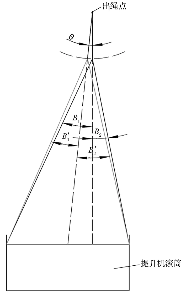 調整天輪和鋼絲繩內外偏角的原則,需保證內外偏角值滿足《金屬非金屬礦山安全規(guī)程》規(guī)定,同時還要確保出繩點位置不改變,即出繩點應維持在罐籠中 心位置的正上方,保證提升容器穩(wěn)定,如圖 2 所示。θ 為 1 號天輪和基座整體旋轉的角度,以出繩點為原點順時針轉動;B1 和 B2 為調整之前的內外偏角,圖片′為調整之后的內外偏角,2 號天輪和 1號天輪的調整方式一致,僅旋轉方向為逆時針方向。